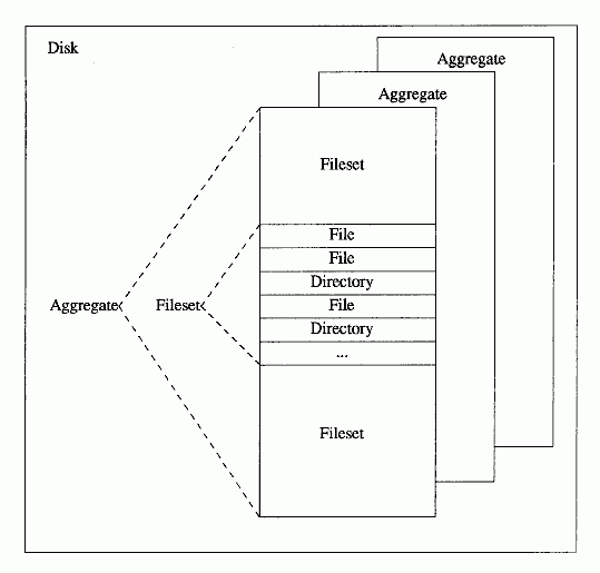 The aggregate is the unit of disk storage, similar to a disk partition. It is also the unit of fileset exporting, which makes the data in filesets available to users of DFS. It can