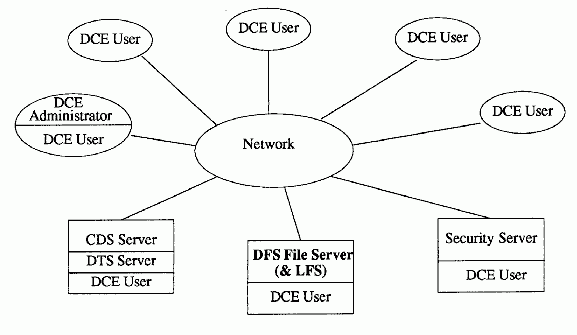 DCE Cell with DFSIn order to have full Distributed File Service support, including DCE's Local File System, a DCE cell can contain one or more DFS file server machines (see the following figure). As mentioned in DCE User Machine Configuration, the DCE user is equipped to act as a DFS client, and may also export the client's local file system to other machines on the network, using the DFS server software. The DFS file server machine, however, is specially equipped with DCE LFS, a physical file system that supports distributed file system features such as file replication, online backup, and other advanced administrative support.