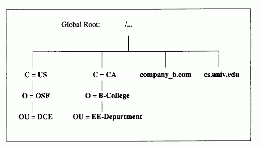 The following is a list of examples of typed and untyped names. /.../C=US/O=OSF/OU=DCE/sec/principals/snowpaws /.../C=US/O=OSF/OU=DCE/fs/usr/snowpaws /.../cs.univ.edu/sec/principals/ziggy /.../cs.univ.edu/fs/usr/ziggy The /... prefix indicates that the name is a global name. The first two names are typed names using X.500 syntax, and the second two names are untyped names using DNS syntax. The first name in each set indicates the name of a user in an authentication database; the second name in each set is the user's home directory in a file system. In each of the name examples, there is a global component and a local component. The global component consists of a cell name, which is registered in a global directory service. In one case, the cell is an entry in the X.500 namespace: /.../C=US/O=OSF/OU=DCE. In the other case, the cell is an entry in the DNS namespace: /.../cs.univ.edu. The remainder of the name is an entry in the cell's namespace; for example, /fs/usr/snowpaws. The names listed above reside in the DCE cell namespace, but it is also possible to maintain names in the X.500 namespace by using GDS. An example of this kind of name is /.../C=US/O=OSF/OU=DCE/CN=SIG-DCE. This name could be used, for example, for an electronic mail list.