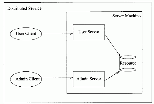 The user client component is typically installed on DCE users' workstations. The administration client might run only on the workstation used by the administrator of the service. Both the user server and the administration server run on the server machine, since they require access to the resource (such as a database) that the server manages. The user server and administration server may actually run in the same process, or be implemented by several processes. As an example, consider the DCE security service. One part of the security service software is the login facility, which sets up a user's security environment. This is an example of a user client. It communicates over the network with the privilege server, which runs on the security server machine. The privilege server is an example of a user server. An example of an administration client in the security service is the rgy_edit program, which administrators use to modify data in the security database. It communicates over the network with the registry server, which runs on the security server machine. The registry server is an example of an administration server. The software for each of the DCE services, namely the directory service, the Distributed Time Service, the security service, and the Distributed File Service, can all be divided roughly into these four configuration components. DCE Threads and DCE RPC are separate configuration components. They help to implement the communications between machines, so they must be present on every DCE machine, whether the machine acts as a client or a server. DCE Machine Configuration Examples describes how machines participating in a DCE environment are configured, using various combinations of configuration components. The topic titled DCE Cell Configuration Examples describes how DCE cells are configured, using various combinations of DCE machines.