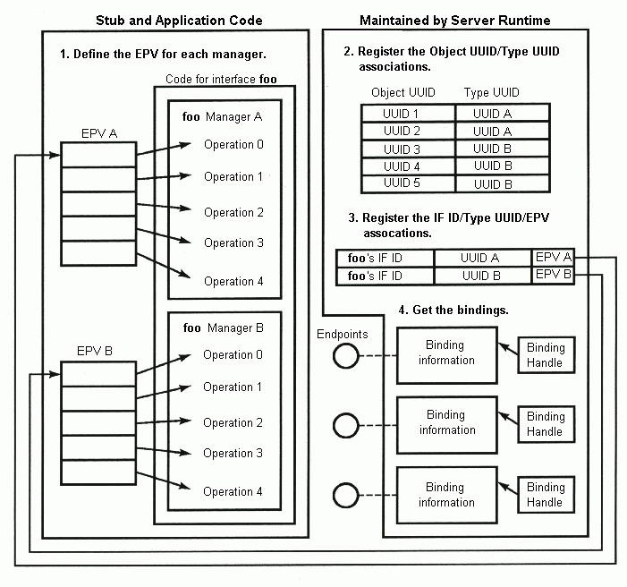 The indirect mapping from object UUID to type UUID to EPV (and hence to the manager called) also gives the server some flexibility in organizing its resources based on object UUIDs. This is explained in Call Routing.
