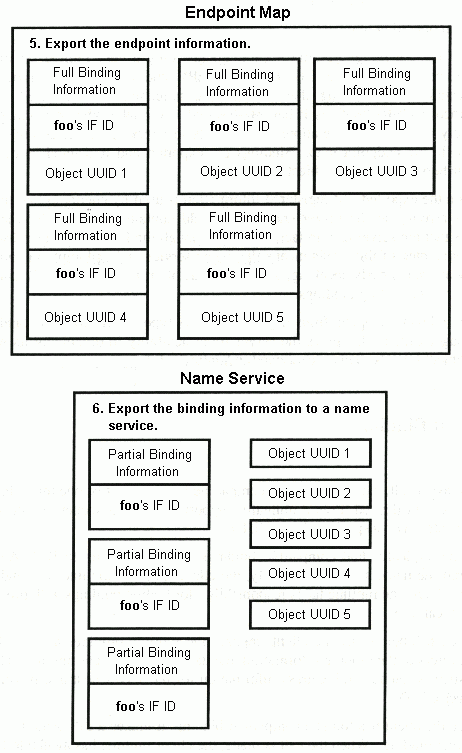 Note that the server runtime itself maintains only a very limited set of relationships: interface identifier/type UUID/manager EPV and object UUIDs/type UUIDs. It is especially worth noting that the runtime maintains no relationships between the protocol-address bindings it has created and any of the other information. The server merely advertises the relationships it wants to export in a name service and registers them in the endpoint map. Bindings are exported and registered along with interface identifiers and, possibly object UUIDs.