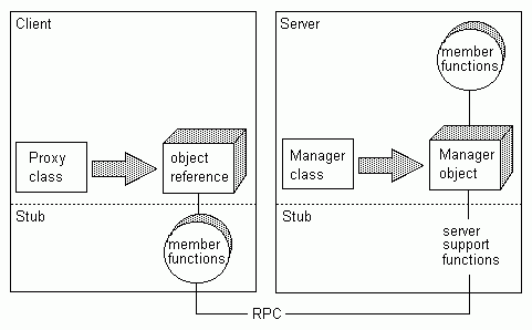 When a member function is called, the function in the client stub executes to handle the RPC. The stub of the server managing the object receives the RPC and dispatches the call to the appropriate manager object code and its member function implementation. The actual object is an instance of the manager class.