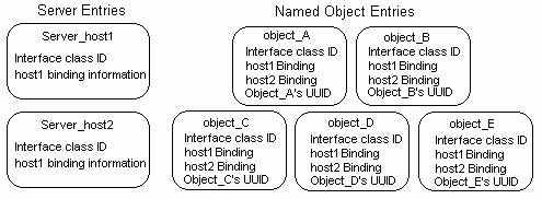 The object name is application specific, and each server exports its binding information to both its server entry and the object entries it supports. The name service entries for each object associate the object name with the combination of interface class ID, binding information (protocol sequence and host name) for each supported server, and object identifier (a UUID).