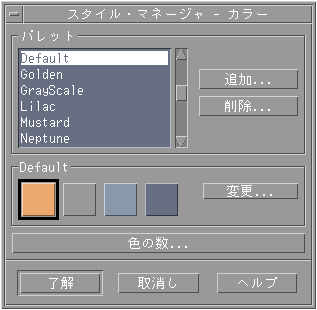 セッション・マネージャでは,デスクトップの前景色と背景色に影響を与えるいくつかのリソースがあります。 また,多くのアプリケーションには, 前景色と背景色を設定するためのリソースがあります。ただし,以上の問題を解決する最も簡単な方法は, スタイル・マネージャで別のパレットを選択すること([ 変更...]ダイアログ・ボックスを使用して現在のパレットを変更すること) です。