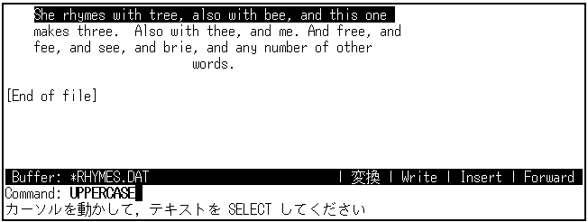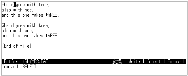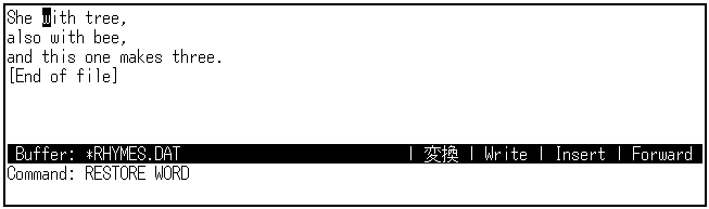 短縮形を区別できる十分な文字をタイプし,[Return]キーを押すと, そのコマンドが実行されます。また,バッファ名,ファイル名, および MARK コマンドのラベル名も,同様に省略することができます。 これらの場合も,短縮形があいまいなときには, 日本語EVEは対応するもののリストを表示します。