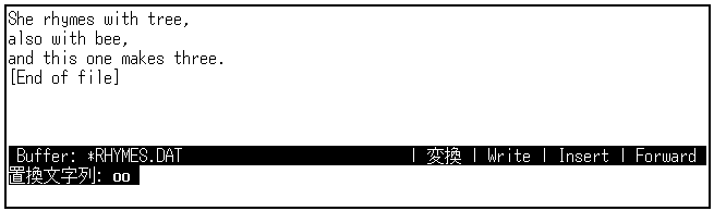 日本語EVEは,カーソルをバッファの先頭に移動し, ユーザがテキストを入力するのを待ちます。 次に示すテキストをSCHEDULE.DATファイルに入力すると, [End of file]マーカはバッファ内で下に移動します。