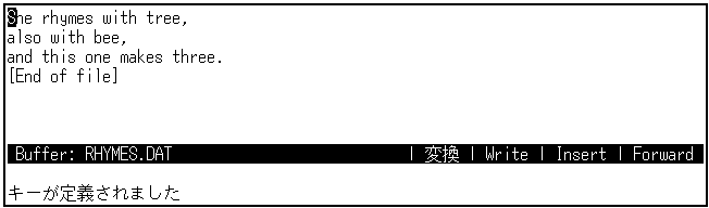キーボードから文字をタイプ入力できます。 日本語EVEは,バッファの現在のモード(挿入モード/重ね書きモード)にしたがって, バッファの現在のカーソルの位置に文字を追加します。