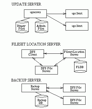 These processes are the server side of the update server (which runs both on machines that contain master copies of configuration files and on machines that contain master copies of binary files), the fileset location server (which runs on machines on which the fileset location database is located), and the backup server (which runs on machines on which the backup database resides).