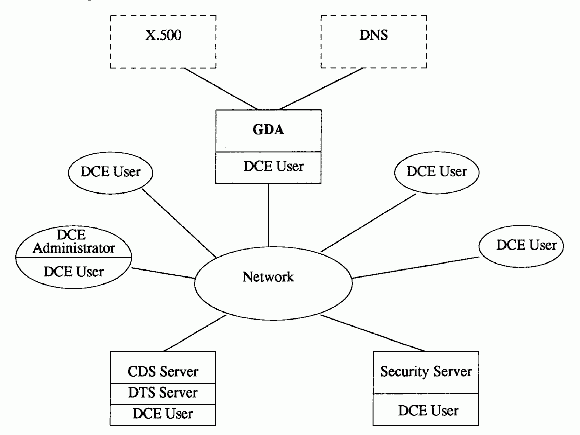 A cell's CDS communicates with CDS servers in foreign cells with the help of an intermediary, the Global Directory Agent (GDA). When a GDA machine is added to a DCE cell, the machines in the cell will be able to contact DCE cells and other systems using X.500 or DNS. The following figure shows the simple DCE cell with a GDA added to it.