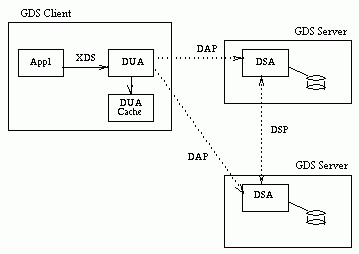 What Is GDS?There are several components that work together to provide the DCE Global Directory Service: · The Directory System Agent (DSA) This process runs on the GDS Server machine and manages the GDS database. It is the server side of GDS. In order to handle simultaneous requests from different users, the GDS Server machine can run several DSA processes. · The Directory User Agent (DUA) The DUA is a library that implements the GDS client; this library is present on all GDS client machines. · The Directory User Agent Cache This process keeps a cache of information obtained from DSAs. One DUA cache runs on each client machine and is used by all the users on that machine. The DUA cache contains copies of recently accessed object entries and information about DSAs. The programmer specifies which information should be cached, and it is possible to bypass the DUA cache to obtain information directly from a DSA. This is desirable, for example, when the user wants to make sure the information obtained is up-to-date. · The C-Stub and S-Stub The C-Stub process runs on each client machine and manages communications with DSAs. It implements the upper layers of the ISO protocol stack (see GDS Relation to Standards ). Its function is similar to the RPC runtime (GDS uses OSI protocols instead of DCE RPC). The S-Stub is similar to the C-Stub, except it runs on the server machine and manages its communications with DUAs and other DSAs. · Shadow update and cache update processes Unlike the processes listed previously, which run continuously, the processes for updating replicas in DSAs and DUA Caches run as needed and then terminate. The shadow update process runs on the GDS Server machine; the cache update process runs on GDS client machines. · The GDS administration programs DCE GDS continues to provide the following three programs for administering its service. One, gdssysadm, supports administration of the local GDS installation, such as configuration, server activation, and backup. The gdsditadm program supports remote administration of the contents of a GDS database. Finally, the gdscacheadm program supports the administration of the contents of the local DUA cache. For Release 1.1, GDS also provides the gdscp and gdssetup programs. The gdscp program allows the administrator to enter object administration functions using command-line and interactive modes. It can be used as an alternative to the Object Administration menu interface and part of the Cache Administration menu interface of the GDS administration program. The gdssetup command provides the administrator with an interface to simplify the process of creating and initializing a directory configuration. The other method of creating and initializing a directory configuration requires that the administrator perform initialization steps by using the masks of the gdsditadm program either manually or by using batch file scripts. The advantages of both of these programs are described in the OSF DCE GDS Administration Guide and Reference. The following figure shows the interaction between the Directory Service application, the XDS interface, and the GDS client and server. The GDS client and server use the Directory Access Protocol (DAP) to communicate. The GDS servers use the Directory System Protocol (DSP) to communicate with one another. DAP and DSP perform functions similar to the function that the DCE RPC protocols perform in other DCE services. The DAP and DSP protocols are defined in the X.500 standard, enabling worldwide interoperability among directory services.