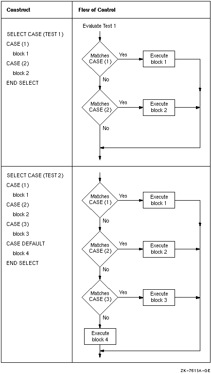 The CASE construct conditionally executes one block of constructs or statements depending on the value of a scalar expression in a SELECT CASE statement.