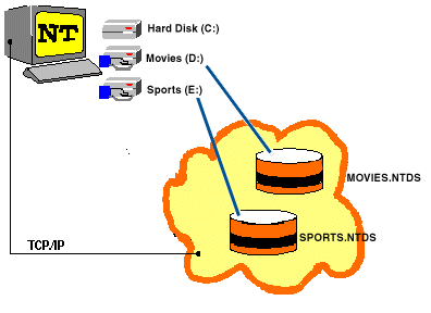 1.1 What is DIGITAL OpenVMS Disk Services for Windows NT?DIGITAL OpenVMS Disk Services for Windows NT lets you use your OpenVMS Cluster to store Windows NT data. The OpenVMS Alpha nodes in your cluster serve virtual disks to Windows NT computers. On the Windows NT computer, you format the virtual disk with a native Windows NT file system, such as NTFS. It behaves just like a locally attached disk, although its data is actually stored in a container file on your OpenVMS Cluster. This picture shows a Windows NT computer whose D: and E: drives are virtual disks whose data is stored in the OpenVMS container files MOVIES.NTDS and SPORTS.NTDS.