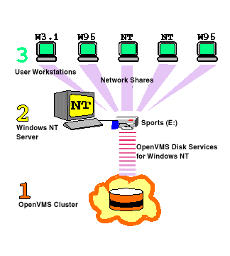 DIGITAL OpenVMS Disk Services for Windows NT is for customers who want to store Windows NT data on OpenVMS Clusters, but who do not need to share files between OpenVMS and Windows NT applications. If you need to share data between OpenVMS and Windows NT applications, you must use a file sharing solution such as PATHWORKS. 1.4 How Does it Fit into the 3-Tier Client-Server Environment?The Windows NT computer can share the virtual disk out to other computers, in the same way that it can share its real disks out to other computers. This makes DIGITAL OpenVMS Disk Services for Windows NT the ideal fit for the 3- tier client-server environment shown in the following picture. Figure 1-1 The 3-Tier Client-Server Environment