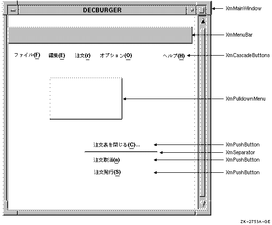 XmPulldownMenuウィジェットは空のプルダウン・メニューを作成します。 プルダウン・メニューの内容を制御するため,XmPulldownMenuウィジェットはXmPushButton ガジェットの子を持っています。たとえば,「注文」のXmPulldownMenu ウィジェットは,3つのXmPushButtonガジェット(「注文表を閉じる」, 「注文取消」,「注文発行」)と,1つのSeparatorガジェットを制御します。