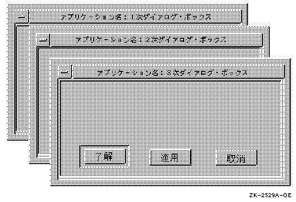 DECwindowsのアプリケーションは1つ以上の1次ウィンドウとそれに関連するダイアログ・ ボックスで構成されます。ダイアログ・ボックスは2次ウィンドウとも呼ばれます。Motif ウィンドウ・マネージャのもとでは,2次ウィンドウは次の特徴を持っています。