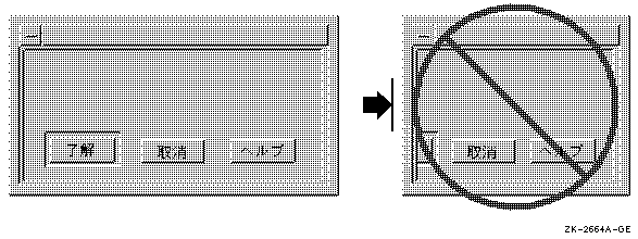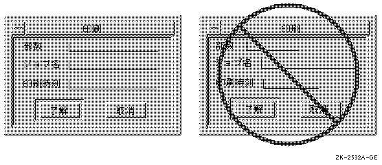 1次モード付きダイアログ・ボックスから祖先ウィンドウにポインタを移動させた際には, 使用アプリケーションがポインタを警告ポインタの形に変え, モード付きダイアログ・ボックスを画面から消去するまでは祖先ウィンドウでは何もできないことをはっきりと示します。 この警告ポインタは「進入禁止」を表わす国際的な記号です。図 1-2 は親ウィンドウで警告ポインタを表示した例です。