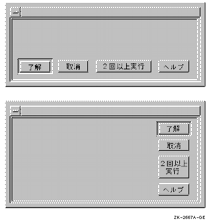プッシュ・ボタンは,図 1-16 で示すように, 下部全体にわたって横に配置するか,図 1-17 で示すように,ダイアログ・ ボックスの右上付近に縦に配置してください。