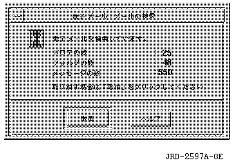 処理中ダイアログ・ボックスは,処理中であることを表示し,ユーザはその処理を取り消すことができます。 処理中ダイアログ・ボックスはモードなしに設定してください。 処理中ダイアログ・ボックスには処理中であることを表わすアイコンがついています。 処理中ダイアログ・ボックスは図 1-23 に示すように,タイトル,メッセージ, および適切にラベル表示したプッシュ・ボタンで構成します。ユーザが選択する可能性の最も高いものを省略時のプッシュ・ ボタンとして設定します。 破壊的な結果ともなう可能性のあるものを省略時のプッシュ・ボタンに設定してはいけません。 次のラベルの組み合わせのいずれかを使用してボタンを配置してください。