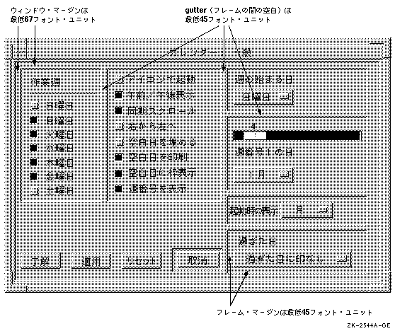 各ダイアログ・ボックスの上部,下部,両サイドのマージンが同じか確認してください。 文字または制御ボタン類がウィンドウの端に触れてはいけません。100 dpi のモニタを想定して,省略時のメニュー・フォントの67 フォント・ユニット分を最小マージンとしてください。 図 1-27 を参照してください。