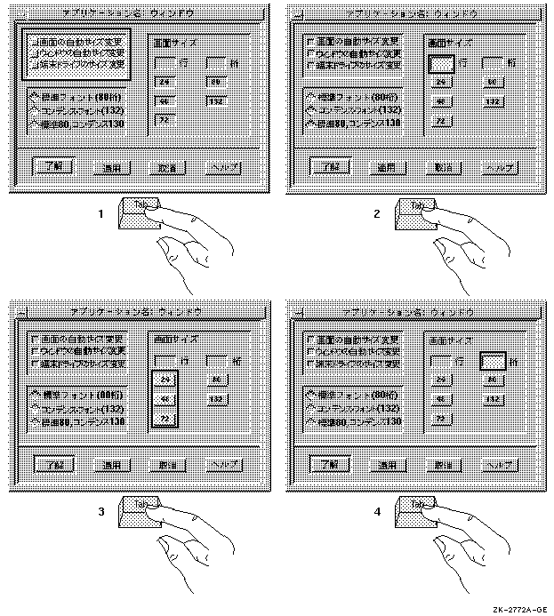 必要と思われる場合は,情報を入力する方法として制御ボタン類(ラジオ・ ボタンやリスト・ボックスなど)を選択することも,テキスト入力フィールドに直接入力することもできるように設定します。 たとえば,図 1-37はユーザがテキスト・ フィールド内でサイズをタイプ入力するか, あるいはプッシュ・ボタンを選択することによってウィンドウのサイズを変更するダイアログ・ ボックスです。