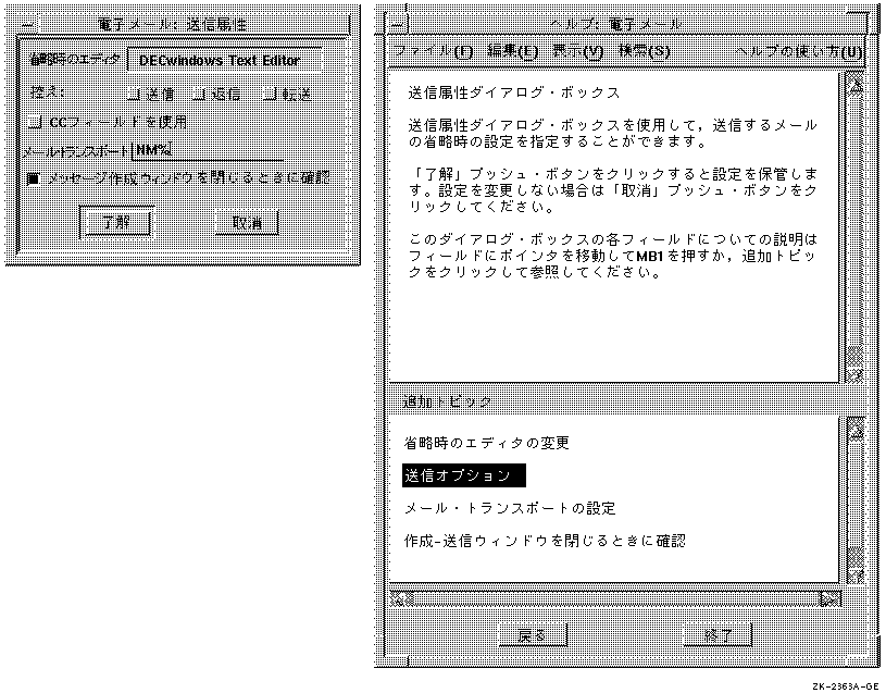 図 5-4はメール・アプリケーションの「送信属性」ダイアログ・ ボックスの概要についてのヘルプを示しています。 ダイアログ・ボックス内の各制御ボタン類(または1組のボタン類) に対応する追加トピックがリストアップされています。追加トピックは制御ボタン類のレイアウトの順番, つまりダイアログ・ボックス内の左から右, 上から下の順番でリストアップされています。