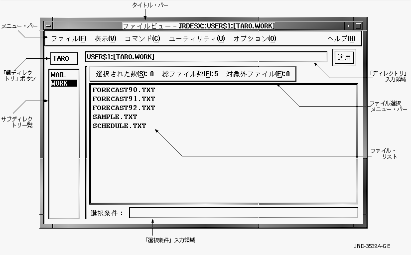 ファイルビューは,OpenVMSオペレーティング・システムを図で表現したものです。 ファイルビューでは,マウスを使用して画面上でテキストやオブジェクトを選択することによって, コマンドを実行したりタスクを実行したりできます。