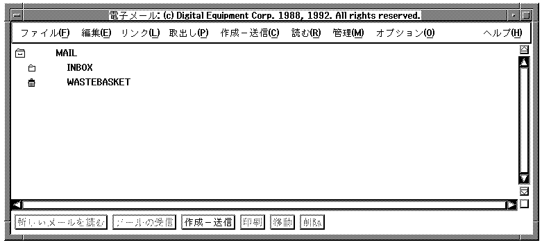電子メールを起動するには,セッション・マネージャの「アプリケーション」メニューから「電子メール」を選択します。 電子メールのメイン・ウィンドウが表示されます。 図 6-13に電子メールのメイン・ ウィンドウを示します。