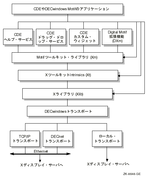 CDEは,これらのUNIXベンダならびにOSF (Open Software Foundation, Inc.)が開発した既存のテクノロジの上に構築されたものです。CDE は,Motifを置き換えるものではなく,図 1-1 に示すように,Motifの上位層として位置付けられる付加的なソフトウェア層です。CDE はMotifを補助するものとしてプログラミング・ ユーティリティを追加し,一貫性のある統合されたユーザ・インタフェースおよび開発インタフェースを提供します。