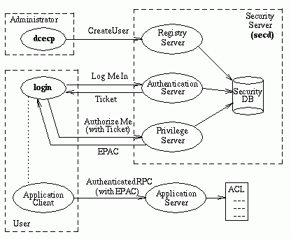 This topic gives an overview of how the DCE security services and facilities interact to provide a secure distributed computing environment. The following figure shows this process. The presentation in this section is a simplified view of the transactions that actually take place.