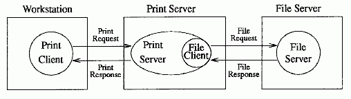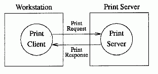 The following figure shows a workstation running the client side of a distributed print program, and a print server running the server side of the distributed program.