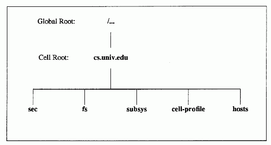 The following figure shows the top of a typical DCE cell namespace. It contains an entry for security information, an entry for the cell's DFS file system, an entry for subsystems such as DCE services, an RPC profile entry, and an entry for host names. (See the OSF DCE Administration Guide - Introduction for more information on the cell namespace.)