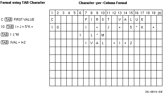 Figure 1-2 shows equivalent Fortran lines first coded with tab formatting, then with fixed formatting.