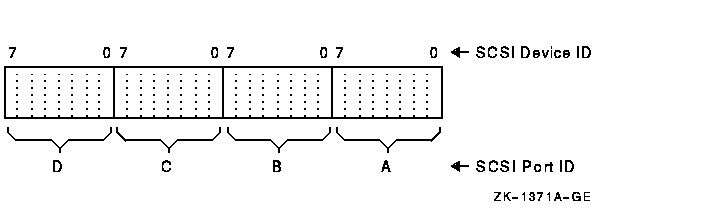 The SCSI_NOAUTO system parameter, as shown in Figure 8-3, stores a bit mask of 32 bits in which the low-order byte corresponds to the first SCSI bus (PKA0), the second byte corresponds to the second SCSI bus (PKB0), and so on. For each SCSI bus, setting the low-order bit inhibits automatic configuration of the device with SCSI device ID 0; setting the second low-order bit inhibits automatic configuration of the device with SCSI device ID 1, and so forth. For instance, the value 0000200016 would prevent the device with SCSI ID 5 on the bus identified by SCSI port ID B from being configured. By default, all of the bits in the mask are cleared, allowing all devices to be configured.