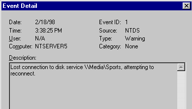 To check whether a Windows NT computer has lost its connection to a disk service, use the NTDS SHOW SERVICES command on all the OpenVMS Alpha nodes that are configured to provide the service. For example: $ RUN SYS$SYSTEM:SYSMAN SYSMAN> SET ENVIRONMENT /NODE=(GREEN,BLUE,YELLOW) SYSMAN> SET PROFILE /PRIVILEGES=SYSPRV SYSMAN> DO NTDS SHOW SERVICES "Movies" The Windows NT computer has lost its connection to the disk service if the OpenVMS node on which the service is active has (none) in the Computer connected field, like this: Disk services available on this node: Service name: Music Status: Active Computer connected: (none) Container file: DISK$MEDIA:[NTDS$CONT]MUSIC.NTDS;1 Take immediate steps to correct the problem that caused the computer to lose the connection, for example, repair the network link.