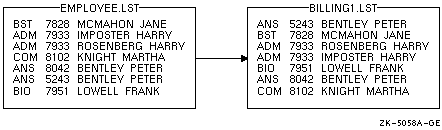 2. この例では,ファイルNAMES.LSTとNAMES2.LSTをソートして, 出力ファイルBYNAME.LSTに出力します。2つのファイルは,1つの大きなファイルとして扱かわれ, ソートされます。