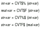 The CVT$% function maps the first two characters of a string into a 16-bit integer. The CVT%$ function translates a 16-bit integer into a 2-character string. The CVT$F function maps a 4- or 8-character string into a floating-point variable. The CVTF$ function translates a floating-point number into a 4- or 8-byte character string. The number of characters translated depends on whether the floating-point variable is single- or double-precision.