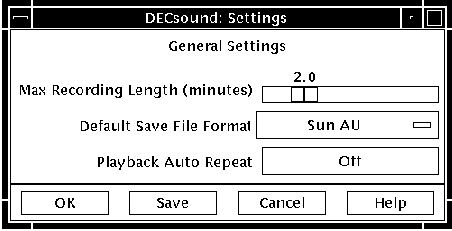Choose Settings... from the Options menu to open the Settings dialog box and specify the following defaults to automatically take effect when you start DECsound. Figure 6-2 shows the DECsound Settings dialog box.