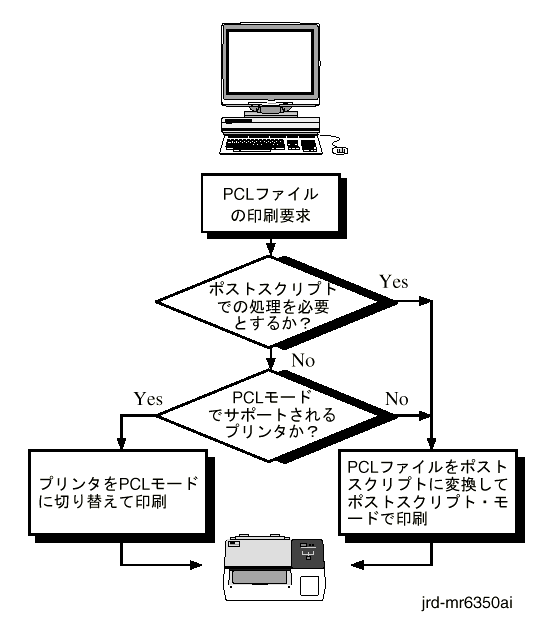 PJLを含むファイルを印刷する場合,DCPSはPJLコードをファイルから分離します。 この処理により,DCPSはPJLを使用してプリンタのプリント・プロトコルを切り替え,PJL をサポートしないプリンタへのこのファイルの印刷を可能とします。