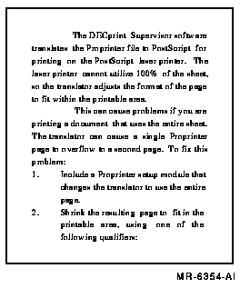 Proprinterファイルを作成するアプリケーションでは,ページ全体を印刷のために使用できことを想定しています。Proprinter 装置などのドット・ マトリクス・プリンタでは,ページ全体が使用されます。一方,DECprint Supervisor for OpenVMS ソフトウェアでサポートされるレーザ・ プリンタでは,印刷可能領域はページ全体より小さく, 印刷可能領域の周囲に余白が残されています。