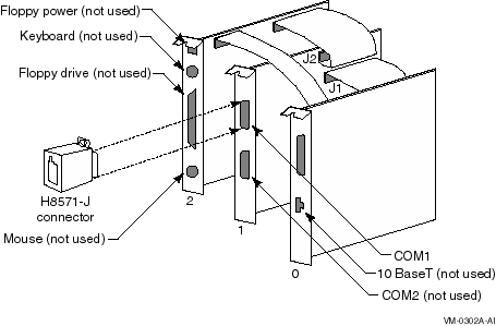 コンソール・ターミナルと追加装置を接続するには,図 6-2 を参照し,コンソール・シリアル・ライン(H8571-Jコネクタ) をCOM1に接続します。