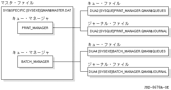 図 12-2は,PRINT_MANAGERとBATCH_ MANAGERという2つのキュー・マネージャを登録したマスタ・ファイルを格納したキュー・ データベースを示しています。各キュー・マネージャにはそれぞれ, キュー・ファイルとジャーナル・ファイルがあります。