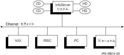 図 23-1に,InfoServerシステムとクライアント・ システムとの関係を示します。この図では,サーバに接続されている2 つのコンパクト・ディスクと2つのハード・ディスクがクライアント・システムからはローカル・ デバイスとして認識されています。VAXシステムとRISC ワークステーションは,ソフトウェアの配布とオンライン・ドキュメンテーション用に1 つまたは2つのコンパクト・ディスクを使用し,一方PC は,InfoServerシステム上のディスク・パーティションを参照することができます。 また,XターミナルはInfoServerシステムからブートし, ページ・ファイル,フォント・ファイル,カスタマイズ・ファイル用にInfoServer ディスクを使用します。