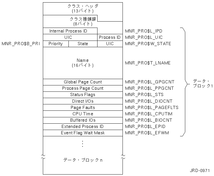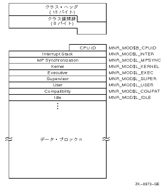 | Ticks | MNR_ VEC$L_TICKS | ベクタ使用プロセスがプロセッサにスケジューリングされた10 ミリ秒単位のクロック・ティック数(1ロングワード) |