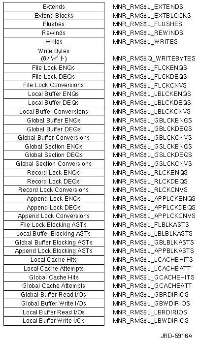 | Local Buffer Write I/Os | MNR_RMS$L_ LBWDIRIOS | ファイルに対するローカル・バッファ書き込み動作の数( ロングワード,C) |