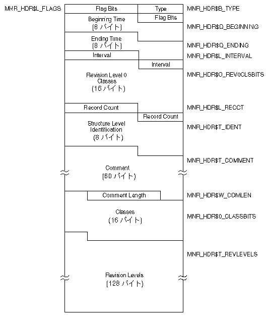 | Structure Level Identification | MNR_ HDR$T_IDENT | MONITOR記録ファイル構造レベルID (MON30050) (8バイト) |