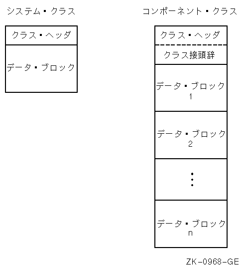 システム・クラスのクラス・レコードは1つのクラス・ヘッダで始まり, 次にデータ・ブロックが1つ続きます。コンポーネント・クラスのクラス・ レコードは1つのクラス・ヘッダで始まり,クラス接頭辞1つと各要素に付き1 つのデータ・ブロックが続きます。