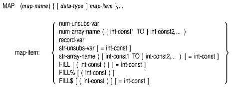 The MAP statement defines a named area of statically allocated storage called a PSECT, declares data fields in the record, and associates them with program variables.