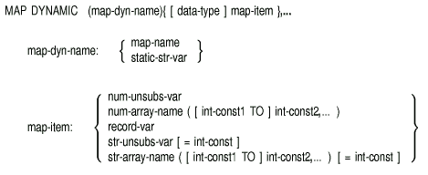 The MAP DYNAMIC statement names the variables and arrays whose size and position in a storage area can change at run time. The MAP DYNAMIC statement is used in conjunction with the REMAP statement. The REMAP statement defines or redefines the position in the storage area of variables named in the MAP DYNAMIC statement.