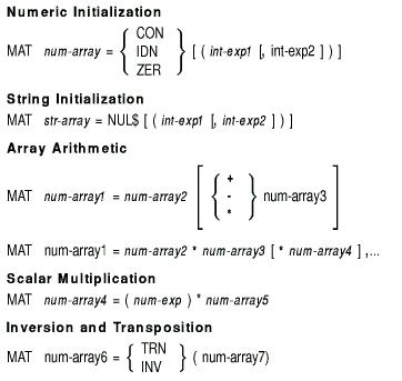 The MAT statement lets you implicitly create and manipulate one- and two-dimensional arrays. You can use the MAT statement to assign values to array elements, or to redimension a previously dimensioned array. You can also perform matrix arithmetic operations such as multiplication, addition, and subtraction, and other matrix operations such as transposing and inverting matrices.